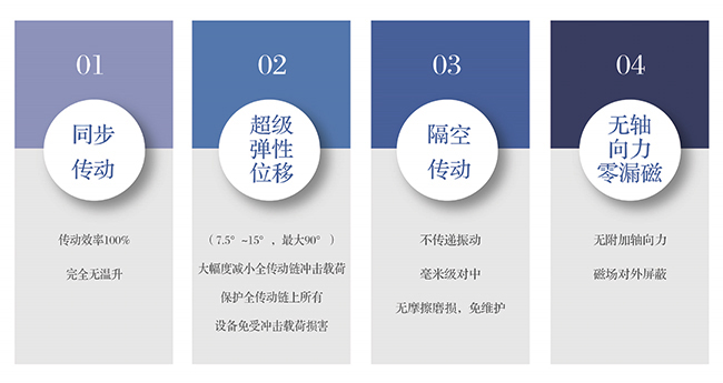 通過永磁體的磁力將原動機與工作機聯接起來的一種具有保護功能的新型聯軸器,利用稀土永磁磁場進行磁懸浮隔空傳動,同步傳遞轉矩,可取代傳統聯軸器的硬(機械)聯接,實現軟(磁)聯接。