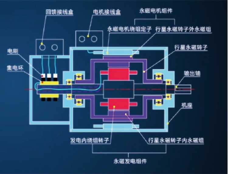 多功能雙永磁調(diào)速一體機(jī)是永磁電動(dòng)機(jī)與永磁發(fā)電機(jī)嵌套集成的多功能電機(jī)。主要由內(nèi)繞組轉(zhuǎn)子、內(nèi)外雙永磁行星轉(zhuǎn)子及電機(jī)定子繞組組成,其中內(nèi)繞組轉(zhuǎn)子是輸出軸,永磁行星轉(zhuǎn)子的外永磁體與電機(jī)定子繞組電磁耦合形成永磁電機(jī);內(nèi)繞組轉(zhuǎn)子與永磁行星轉(zhuǎn)子的內(nèi)永磁體電磁耦合形成發(fā)電機(jī),控制內(nèi)繞組中的感生電流的大小控制轉(zhuǎn)子的輸出轉(zhuǎn)矩與轉(zhuǎn)速。并將內(nèi)繞組中多余能量通過(guò)集電環(huán)回饋至電網(wǎng)再利用。